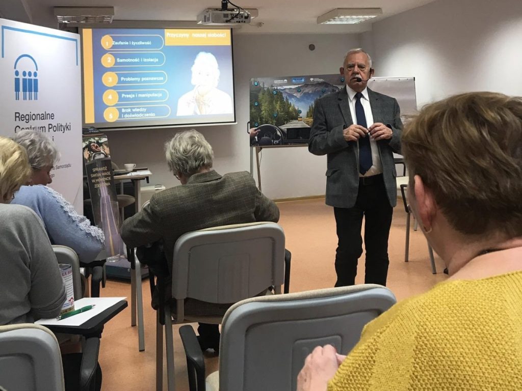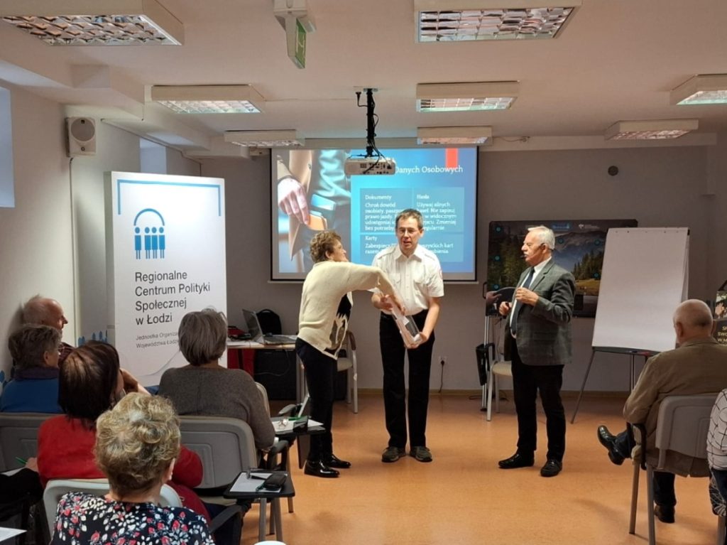 25 i 26 lutego br. w Regionalnym Centrum Polityki Społecznej w Łodzi nasi instruktorzy przeprowadzili szkolenie dotyczące bezpieczeństwa seniorów w przestrzeni publicznej. Tematyka warsztatów obejmowała m.in. psychologiczne aspekty uczestnictwa seniorów w życiu społecznym, podstawy udzielania pierwszej pomocy, bezpieczeństwo seniorów w ruchu drogowym, bezpieczne korzystanie z internetu i bankowości. Omówione zostały współczesne formy zagrożeń (fałszywe promocje, zbiórki, metody wyłudzeń telefonicznych, oszustwa internetowe itp.).